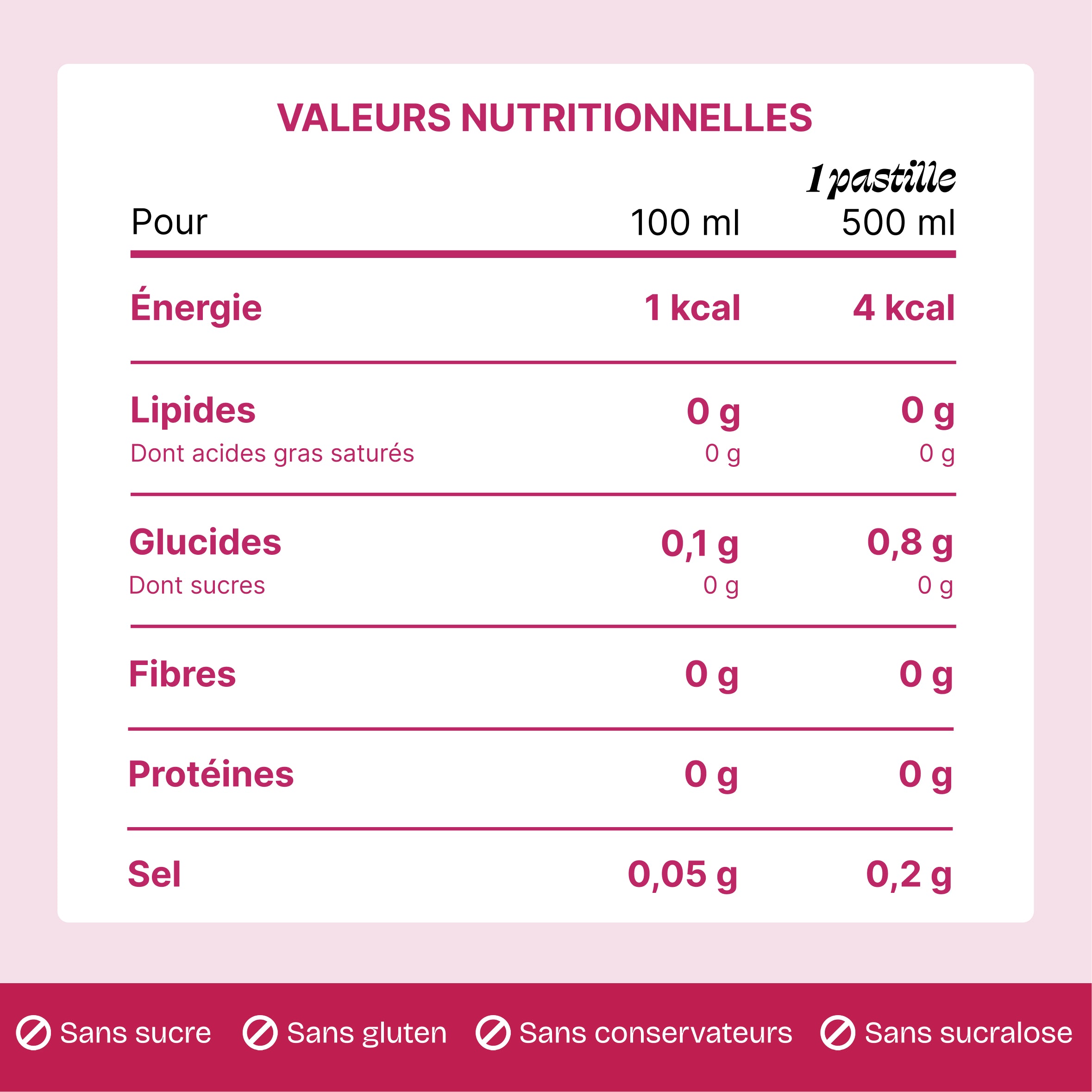 Voici le tableau nutritionnel pour une bille diluée dans 500mL d'eau :